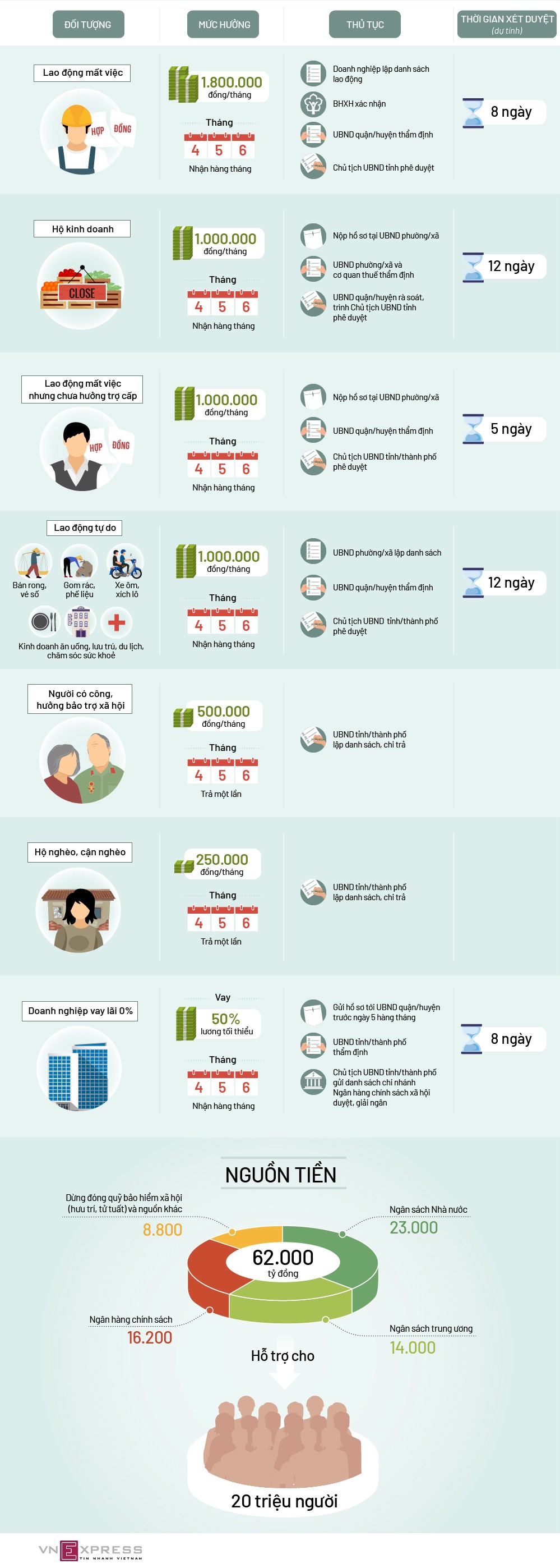 Theo Vnexpress Tin liên quan Ai được hỗ trợ từ gói 62.000 tỷ đồng? 26/04/2020 08:41 Nhóm lao động nào được nhận hỗ trợ 1,8 triệu đồng/tháng? 19/04/2020 08:52 Gói hỗ trợ chưa từng có trong tiền lệ và trách nhiệm sẻ chia 13/04/2020 09:01 Đề xuất gói hỗ trợ 62.000 tỷ đồng, hướng đến 20 triệu đối tượng 06/04/2020 14:36 Từ khóa lao động mất việc lao động tự do Covid-19 gói 62.000 tỷ đồng thủ tục nhận hỗ trợ