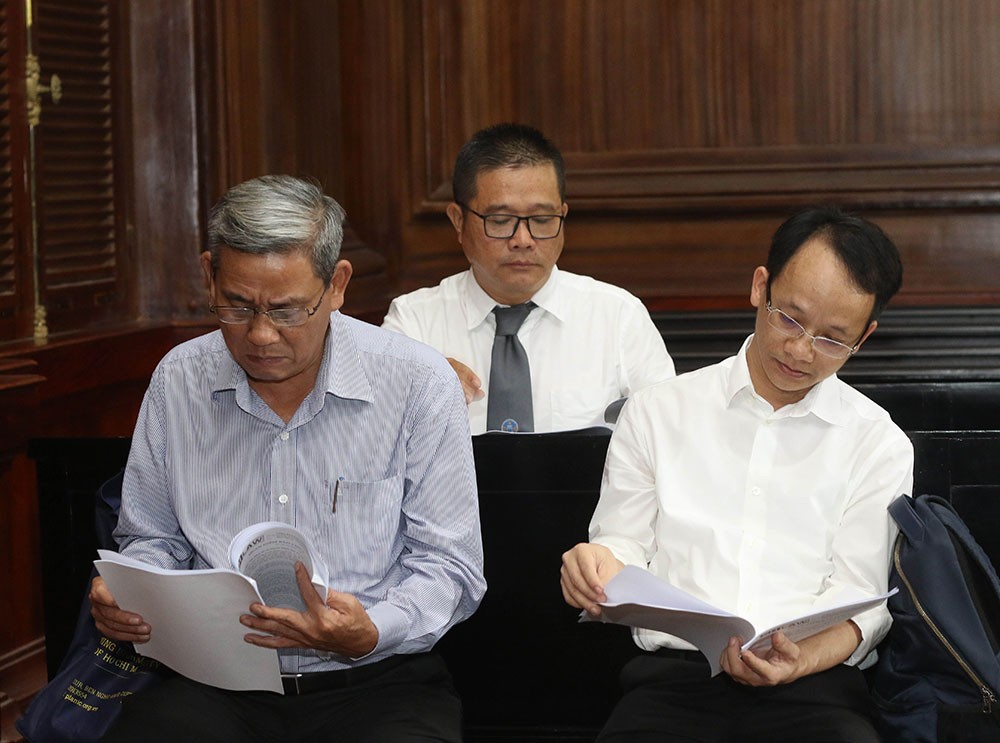 Luật sư và các bị cáo nghiên cứu tài liệu.