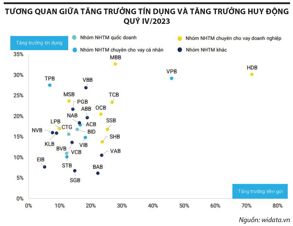 Với nhóm ngân hàng chuyên cho vay cá nhân, tình trạng tăng trưởng tiền gửi thấp hơn cho vay cũng diễn ra, song mức độ chênh lệch giữa tăng trưởng tín dụng và tăng trưởng huy động giữa các ngân hàng có sự phân hóa lớn.