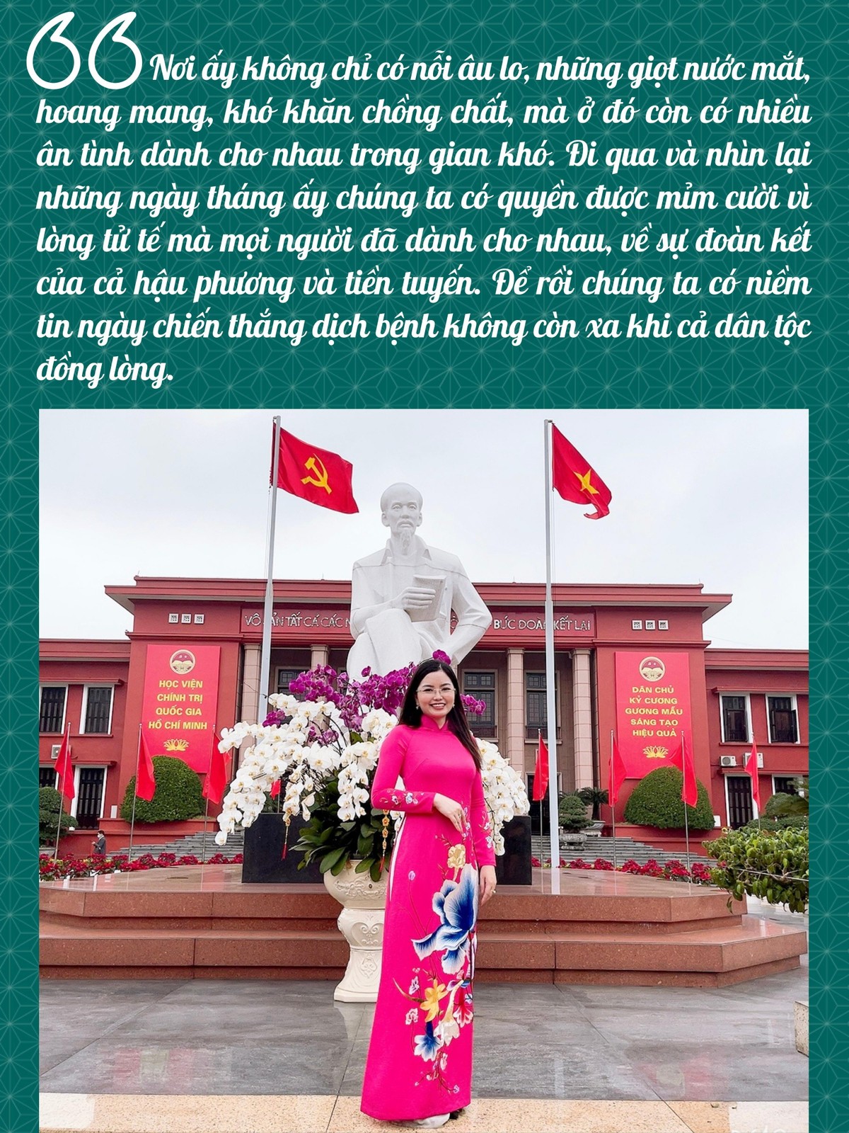 “Mỗi nơi đều có những câu chuyện cảm động về tình người, những nỗ lực vượt qua khó khăn, thiếu thốn, không quản ngại gian khó, thậm chí là hi sinh để cứu chữa cho người bệnh. Từng cá nhân, tập thể mà tôi đã gặp, trò chuyện, cùng làm việc tại nơi tuyến đầu” ấy là những mảnh ghép muôn màu đã đóng góp sức lực vào thành quả chung kiểm soát và đẩy lùi được dịch bệnh trong thời gian ngắn nhất được đẩy lùi và kiểm soát”, nữ cán bộ của Vụ Truyền thông và Thi đua, khen thưởng trải lòng.