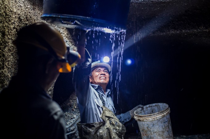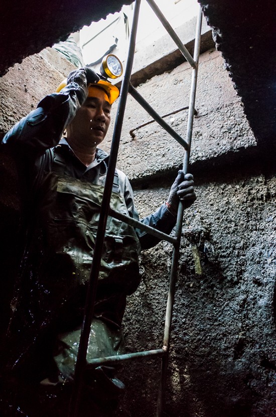 Ngoài đồ bảo hộ, bao tay, ông Hùng cùng đồng nghiệp phải đeo đèn vì trong lòng cống tối om. Với những miệng cống rộng và sâu 2,2 m, các công nhân dùng thang sắt để đi xuống, còn với những cống nhỏ hơn, họ phải luồn lách người để chui xuống.