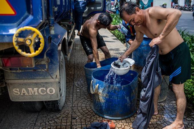 Trước khi nghỉ ngơi, ăn trưa để lấy sức, những công nhân cùng tắm giặt trên góc đường. "Ngày nào cũng vậy, các anh em phải mang theo hai bộ đồ để mặc. Nghề này nếu không tắm giặt và thay đồ thì ngứa không chịu nổi", ông Thưởng chia sẻ.
