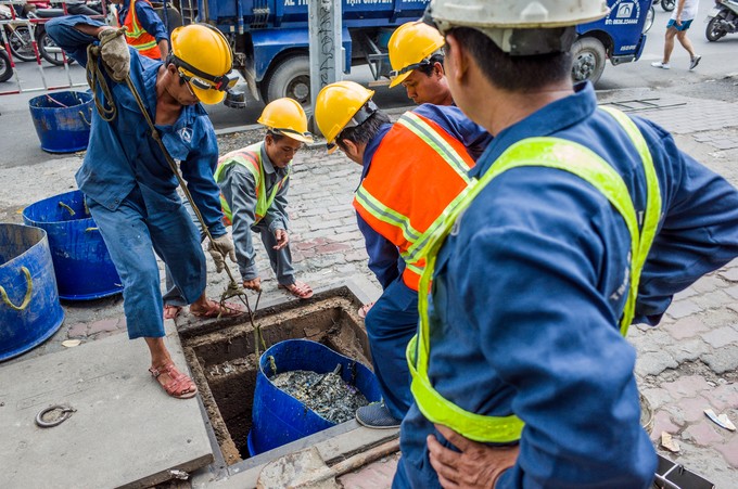 Dầm mình trong nước cống hôi thối, nhóm công nhân dùng rổ để vớt các loại rác. Họ cho biết, theo định kỳ một tháng phải vớt rác một lần, nhưng vào mùa mưa phải vớt liên tục để đảm bảo cống luôn thông thoáng, không gây ngập đường. "Ngại nhất là lúc vừa mưa xong, chui xuống cống ngập ngụa rác nhưng đành bặm môi bịt mũi làm cho xong công việc", một công nhân nói.