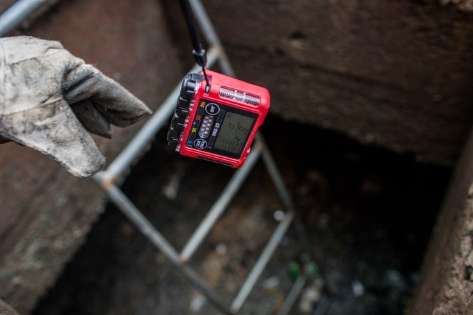 Trước khi xuống cống vớt rác, công nhân dùng thiết bị đo nồng độ khí độc trong cống. "Nếu nồng độ khí độc vượt mức cho phép, máy sẽ kêu lên, mình phải mở nắp cống và chờ cho khí bay đi mới được xuống. Nếu không thử mà chui xuống có khi sẽ bỏ mạng vì ngạt khí độc", ông Hùng cho biết.