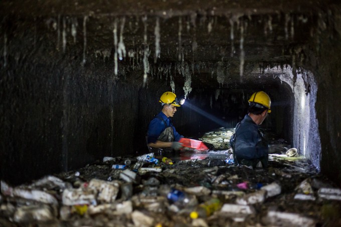 Bên dưới cống, mực nước sâu khoảng 1,2 m, đủ loại rác trôi nổi lềnh bềnh, từ hộp nhựa, túi nylon, chai lọ, xác động vật chết, thậm chí cả gián và chuột. Lẫn trong lớp bùn sình dưới chân là mảnh chai, kim tiêm, dao, kéo... "Việc bị đứt tay đứt chân là chuyện như cơm bữa với chúng tôi", ông Hùng chia sẻ.