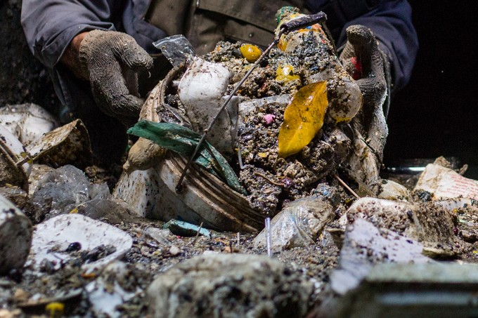 Lùa tay vớt rác chưa đầy 2 phút, ông Thưởng đã gom đầy thùng nhựa với đủ loại phế thải.