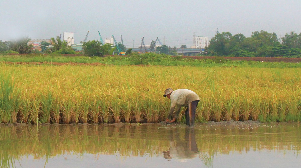 “Ở đây một năm trồng hai vụ lúa, cả khu vực này còn hơn 20 nhà làm ruộng với vài trăm héc-ta đất. Chúng tôi làm ruộng ở đây từ đời ông bà để lại. Hồi trước, nơi đây rộng lắm, nhưng sau đó Thành phố đền bù làm đường, làm cầu, làm khu công nghiệp và Khu đô thị mới Thạch Mỹ Lợi, nên thu hẹp lại, nay chỉ còn từng đây ruộng”, ông Cường chỉ vào cánh đồng lúa và nói.