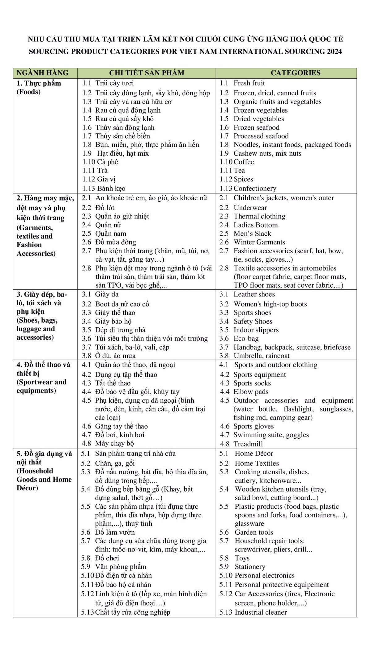 Theo thông tin từ Ban tổ chức Chuỗi sự kiện “Kết nối chuỗi cung ứng hàng hóa quốc tế” (Viet Nam International Sourcing 2024), bên cạnh nhóm hàng “ăn khách” là thực phẩm, năm nay các nhà mua hàng đặc biệt quan tâm đến nhóm hàng dệt may và phụ kiện thời trang; giày dép, ba lô, túi xách và phụ kiện; đồ thể thao và thiết bị; đồ gia dụng và nội thất.