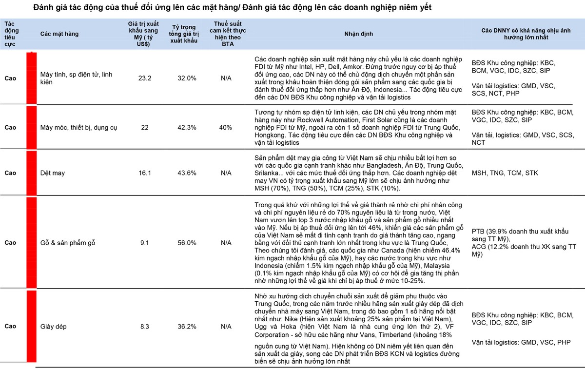 Đối với tác động của việc tăng thuế đối với từng nhóm hàng xuất khẩu, thời điểm hiện tại, mức thuế suất đối với từng mặt hàng vẫn chưa được công bố, nhưng chuyên gia của MBS cho rằng, tác động đến các ngành nghề sản xuất sẽ khác nhau phụ thuộc vào tỷ trọng xuất khẩu sang Mỹ trong tổng giá trị xuất khẩu, cũng như các đối thủ cạnh tranh của Việt Nam trong cùng phân khúc. Bên cạnh đó, một số mặt hàng còn có hiệu lực về mức thuế cam kết được áp dụng theo Hiệp định Thương mại Việt Nam - Hoa Kỳ có hiệu lực tháng 12/2001.