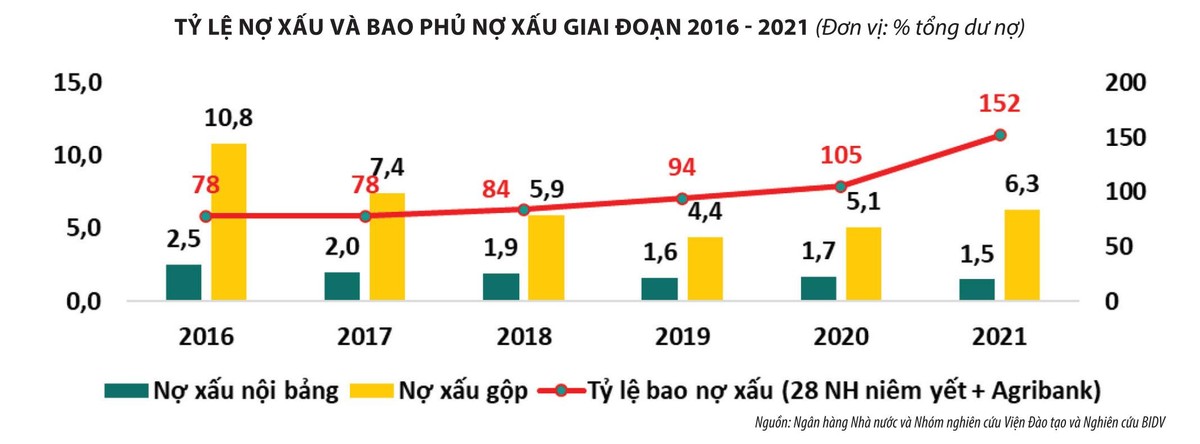 Tuy nhiên, ngành ngân hàng đối diện với áp lực từ việc nợ xấu tăng nhanh, đạt mức cao nhất trong vòng 4 năm trở lại đây, phá vỡ thành quả giai đoạn tái cơ cấu các tổ chức tín dụng 2016 - 2020. Tính đến cuối năm 2021, tỷ lệ nợ xấu nội bảng là 1,5%, nhưng nợ xấu gộp tăng lên mức 6,3%. Mặc dù vậy, các ngân hàng thương mại đã có sự chuẩn bị, nâng tỷ lệ bao phủ nợ xấu từ 78% cuối năm 2016 lên 152% cuối năm 2021.