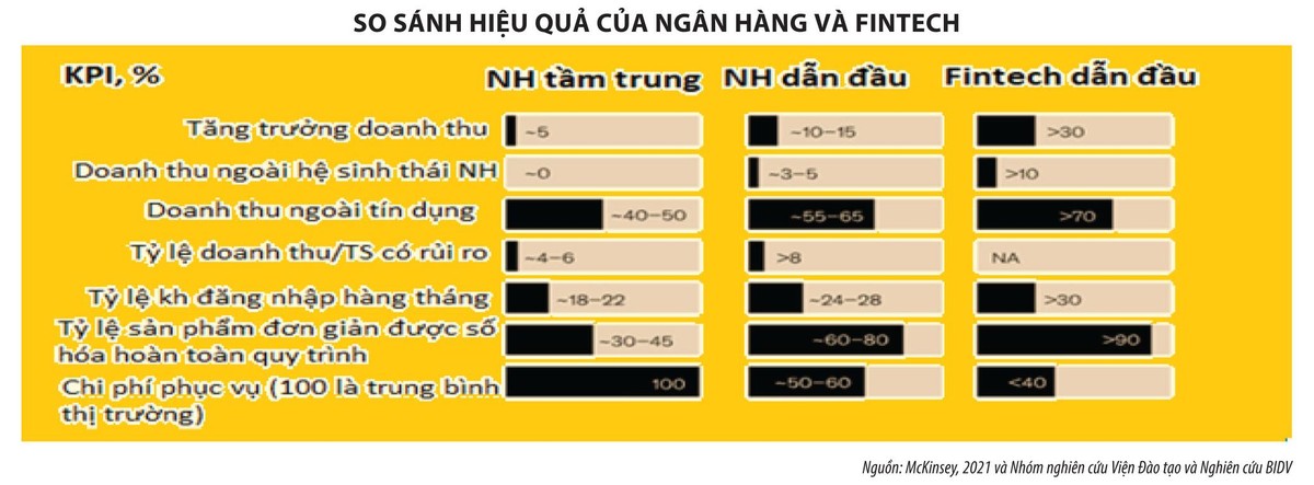 Nghiên cứu của McKinsey (2021) cho thấy, mô hình hoạt động của các công ty fintech đang có hiệu quả tốt hơn cả những ngân hàng hoạt động hiệu quả nhất (xem Đồ thị 2). Theo một nghiên cứu khác của McKinsey (2021), mức thâm nhập dịch vụ fintech và ví điện tử của Việt Nam đạt 56% trong năm 2021, cao hơn mức trung bình của các nước châu Á - Thái Bình Dương mới nổi (53%) và phát triển (43%). Trong tương lai gần, dưới sự tác động của 3 xu hướng gồm quy định pháp luật ngày càng mở hơn cho fintech, các bigtech trong nước và nước ngoài với tiềm lực mạnh về tài chính, kinh nghiệm cả về công nghệ và tài chính đang tăng cường mua lại các fintech Việt Nam, mảng thị trường các ngân hàng chưa phục vụ của Việt Nam còn rất lớn, thì sự cạnh tranh của fintech và bigtech với ngân hàng sẽ ngày càng rõ hơn.