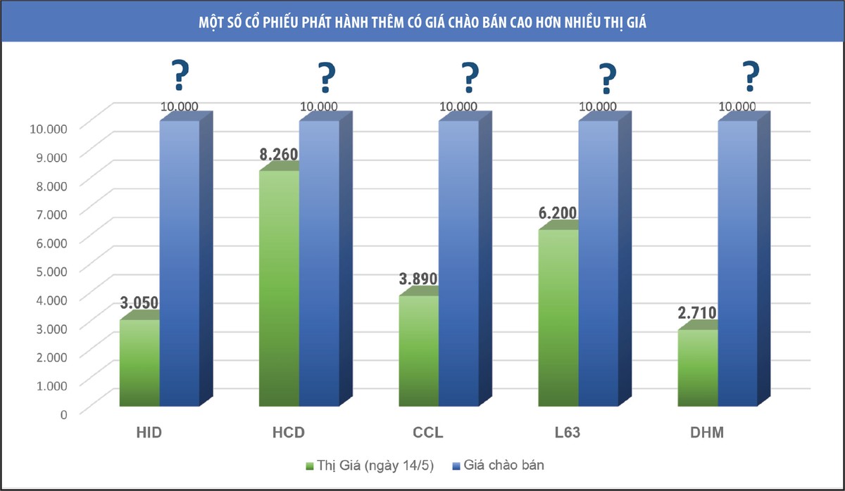 Từ đầu năm đến nay, việc phát hành cổ phiếu với giá cao hơn nhiều thị giá giao dịch trên sàn đã được ghi nhận tại một số doanh nghiệp như Công ty cổ phần Đầu tư Sản xuất và Thương mại HCD (HCD), Công ty cổ phần Đầu tư và Phát triển Đô thị Dầu khí Cửu Long (CCL)…