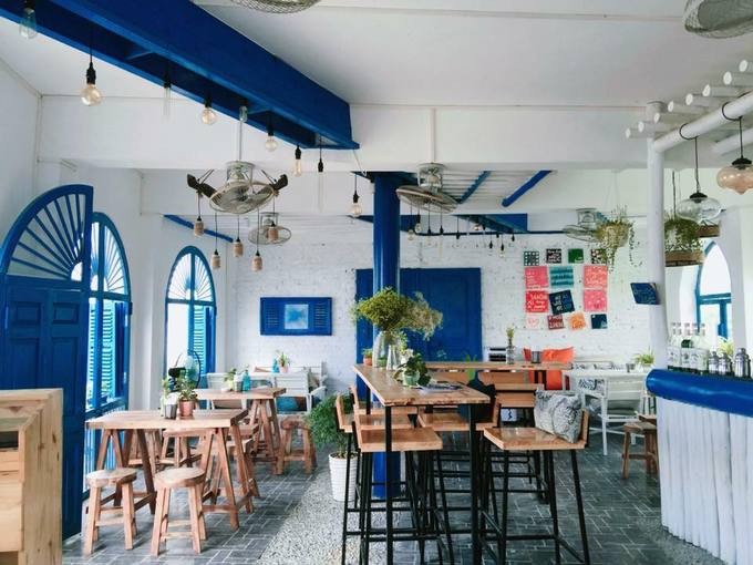 Không gian quán rộng rãi kết hợp hai màu xanh trắng nên tạo cảm giác mát mẻ, dễ chịu. Khách có thể chọn ngồi bên trong hoặc bên ngoài hướng thẳng ra hồ Tây lộng gió. Thực đơn đồ uống ở đây chủ yếu là các loại nước hoa quả, cà phê cơ bản với mức giá khoảng 40.000 đồng một món.