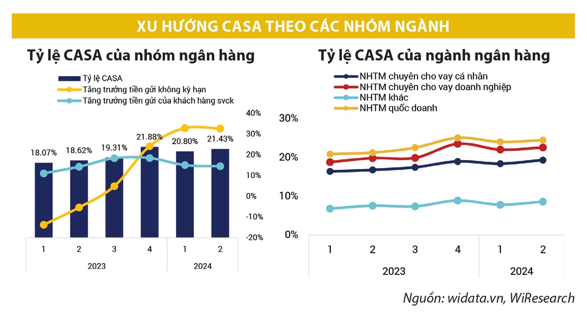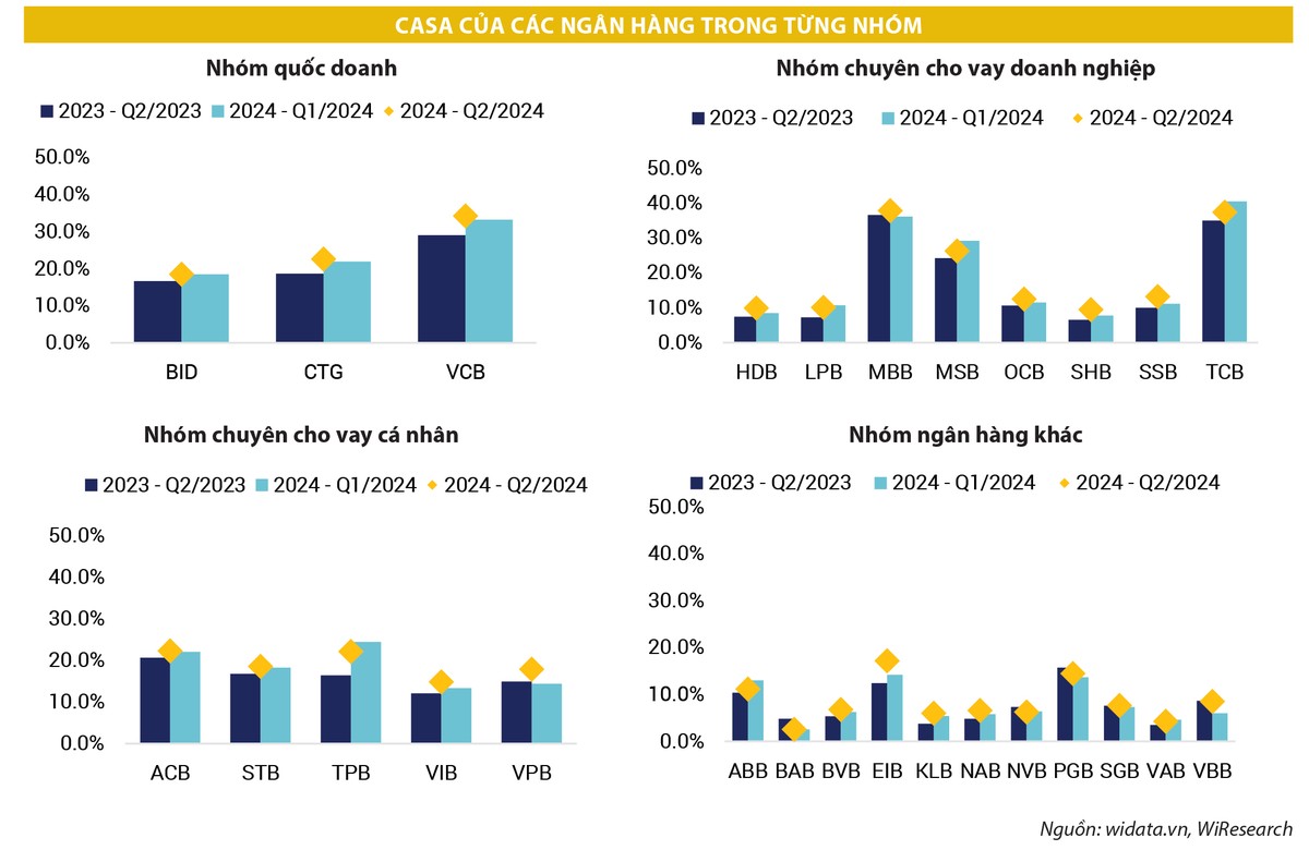 Quý II/2024, nhóm ngân hàng quốc doanh như BIDV và VietinBank đã ghi nhận sự tăng trưởng mạnh mẽ trong tỷ lệ CASA. Tỷ lệ này đã tăng từ 18% lên 23 - 24% nhờ việc đẩy mạnh các dịch vụ thanh toán và các chương trình khuyến mãi nhằm gia tăng cấp tín dụng và cung cấp dịch vụ thanh toán cho hệ sinh thái của các khách hàng doanh nghiệp.