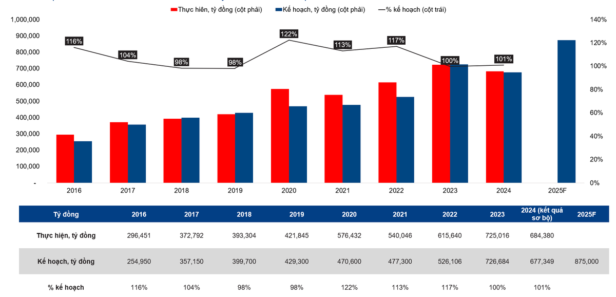 Quay lại với yếu tố cơ bản, theo hình minh họa, năm nay, chính phủ đã tăng chỉ tiêu giải ngân vốn đầu tư công lên rất cao, khoảng 875 nghìn tỷ đồng, trong khi năm 2024 chỉ tiêu chỉ rơi vào khoảng 677 nghìn tỷ đồng. Với việc nợ công vẫn còn thấp so với trần nợ công quy định, cùng với các luật quan trọng như Luật Đầu tư công và Luật PPP đã được thông qua để tháo gỡ rào cản pháp lý cho giải ngân vốn đầu tư công, chúng tôi kỳ vọng mục tiêu này sẽ hoàn thành và 2025 sẽ là một năm có đầy dấu ấn trong mảng này. Với cam kết đẩy mạnh giải ngân, nhóm cổ phiếu hưởng lợi từ đầu tư công được kỳ vọng sẽ dẫn dắt thị trường trong năm nay.