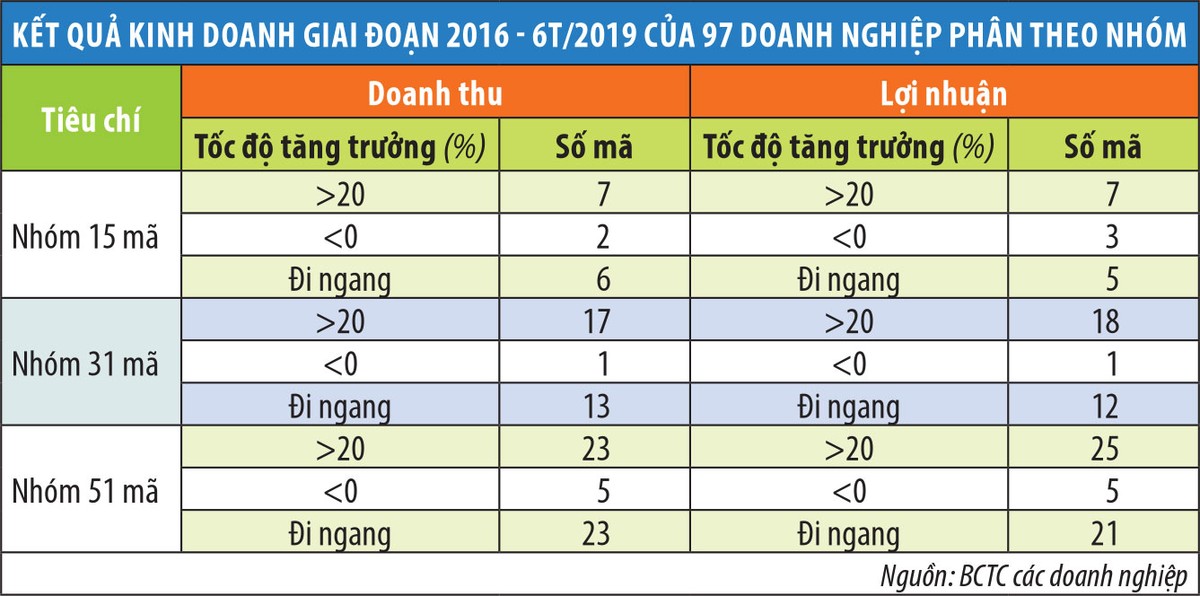 Xét kết quả kinh doanh, trong nhóm 15 mã, có 7 mã tăng trưởng doanh thu, lợi nhuận trung bình trên 20%/năm trong hơn 3 năm qua. Tương tự, trong nhóm 31 mã và nhóm 51 mã, lần lượt có 17 mã và 23 mã đạt mức tăng trưởng doanh thu, lợi nhuận trên 20%/năm (xem bảng).