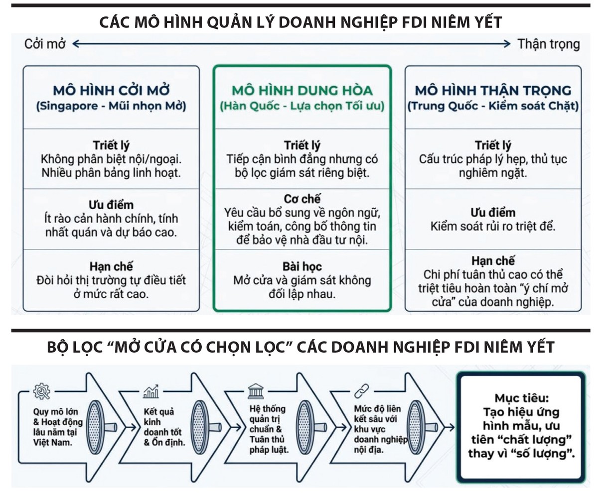 Thứ hai là mô hình dung hòa, điển hình như Hàn Quốc. Ở đây, doanh nghiệp FDI nhìn chung vẫn được tiếp cận thị trường như doanh nghiệp trong nước, nhưng phải đáp ứng thêm một số yêu cầu để bảo vệ nhà đầu tư nội địa, nhất là ở khâu hồ sơ, ngôn ngữ, kiểm toán và công bố thông tin. Cách tiếp cận này gợi ý rằng, mở cửa và giám sát không đối lập nhau. Một thị trường có thể khuyến khích doanh nghiệp FDI niêm yết, song vẫn áp dụng bộ lọc chặt hơn ở các nội dung nhạy cảm như kiểm toán, chuẩn thông tin và giao dịch liên kết.