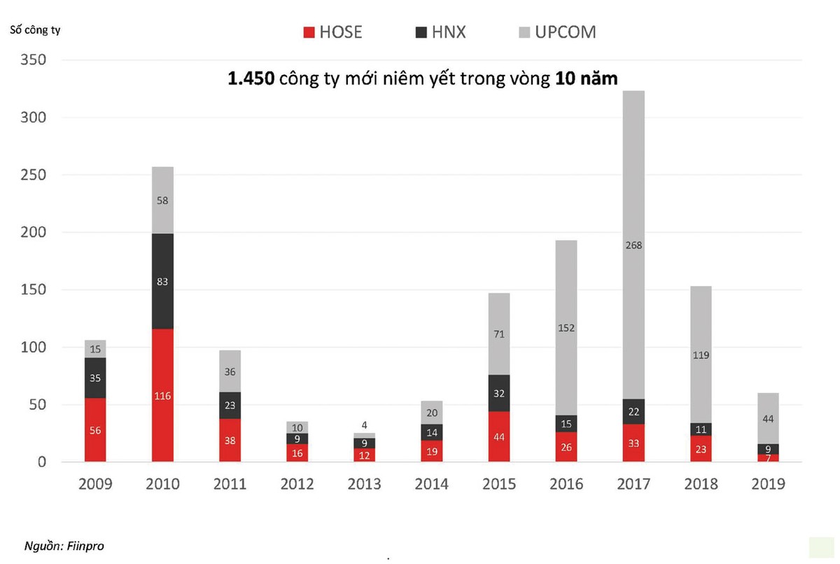 Theo số liệu của Công ty Quản lý Quỹ VinaCapital và Finnpro, trong năm 2018, có 33 doanh nghiệp lên sàn HOSE, 22 doanh nghiệp lên sàn HNX và 268 doanh nghiệp lên UPCoM.
