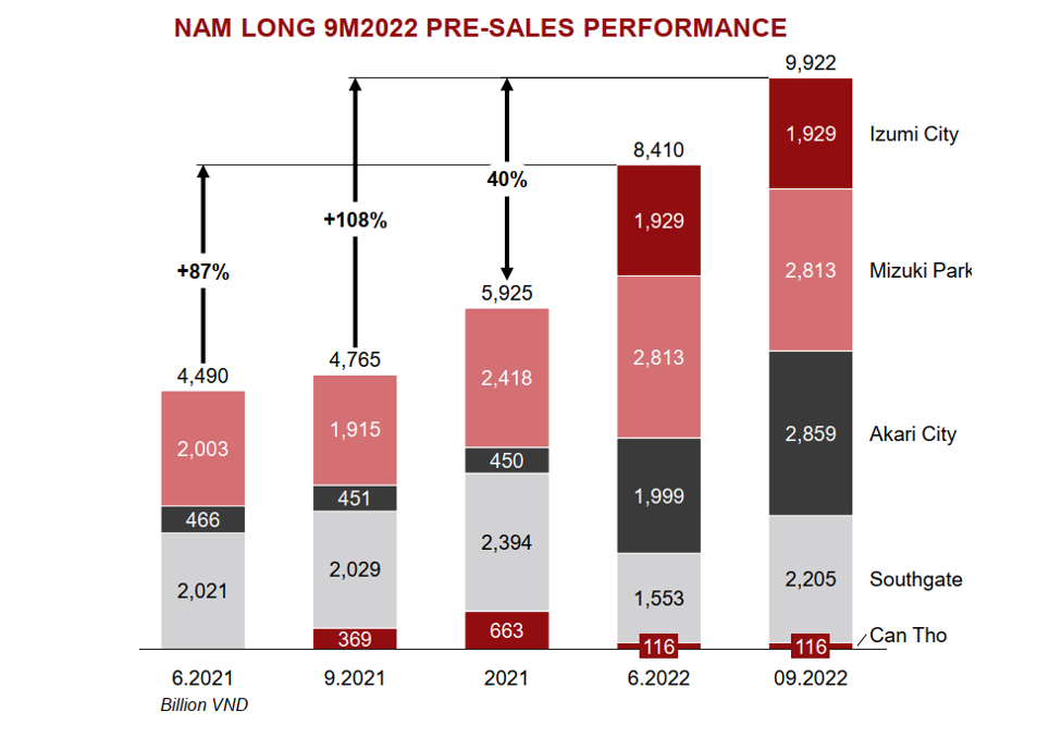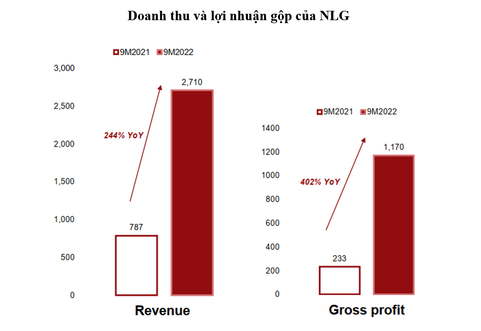 Hoạt động tiền bán hàng của NLG cũng cho thấy những tín hiệu tích cực với tổng doanh số đến tháng 9/2022 đạt gần 10.000 tỷ đồng, tăng 40% so tổng doanh số cả năm 2021 và tăng hơn gấp đôi so với cùng kỳ năm ngoái. Trong đó, doanh số tại dự án Izumi City đạt 1.929 tỷ đồng, dự án Mizuki Park đạt 2.813 tỷ đồng, dự án Akari City đạt 2.859 tỷ đồng và Southgate đạt 2.205 tỷ đồng.