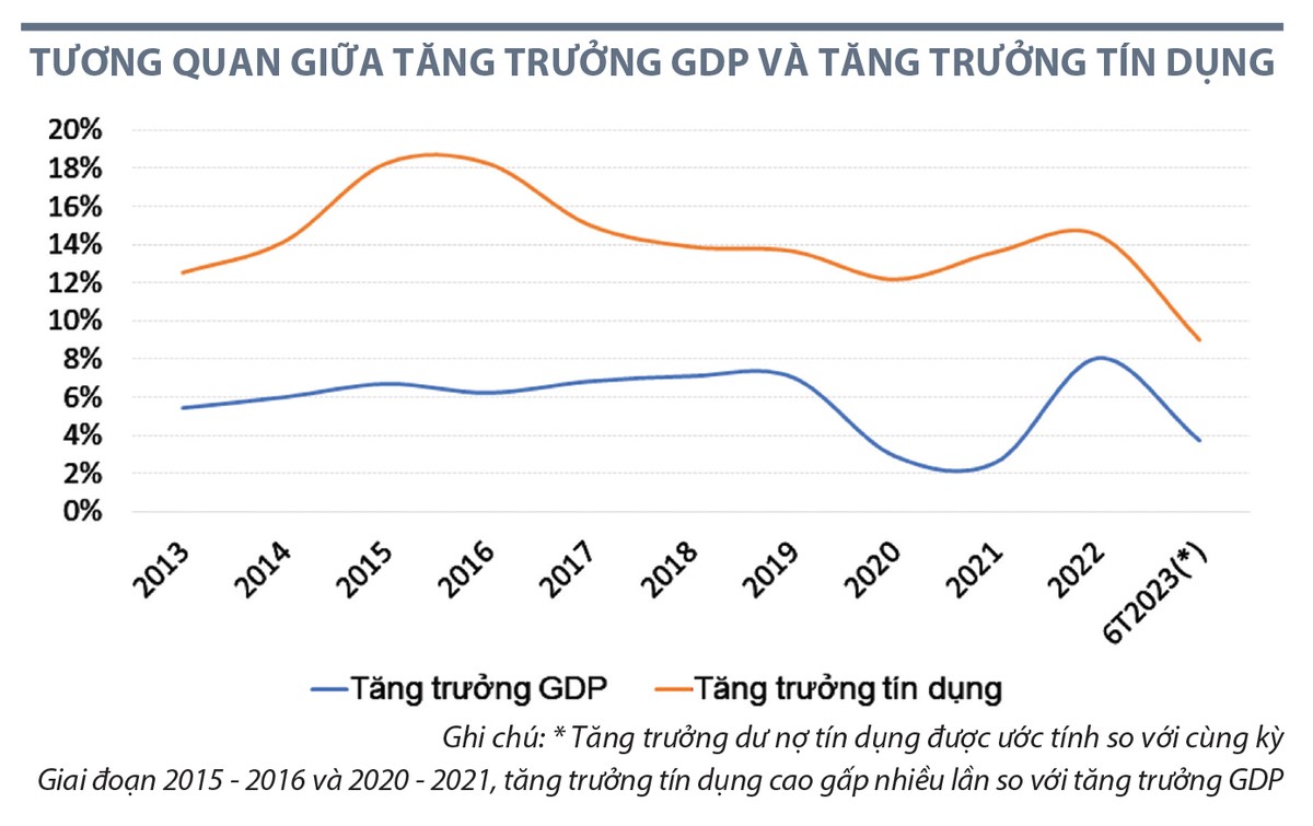 Khoảng 10 năm trở lại đây, trong điều kiện bình thường, tăng trưởng tín dụng của Việt Nam ở mức gấp đôi tăng trưởng GDP, chẳng hạn tăng trưởng kinh tế đạt 6% thì tăng trưởng tín dụng khoảng 12 - 14 %. Trong giai đoạn 2020 - 2021, hoạt động kinh doanh của nhiều doanh nghiệp bị đình trệ do dịch Covid-19, tăng trưởng GDP chỉ đạt 2,5 - 2,9%, song tín dụng vẫn duy trì mức tăng 12 - 13%. Điều này có nghĩa là dòng vốn tín dụng không tăng cường cho sức khỏe của nền kinh tế, mà dịch chuyển sang những lĩnh vực ngoài sản xuất - kinh doanh và tiềm ẩn rủi ro nhiều hơn. Nhìn lại 6 tháng đầu năm nay 2023, tín dụng ước tăng 9% so với cùng kỳ, trong khi tăng trưởng kinh tế chỉ đạt 3,7%. Tuy nhiên, tương quan giữa tăng trưởng tín dụng và tăng trưởng GDP chỉ mang tính tương đối, cần phải được xem xét trên cơ sở một năm.