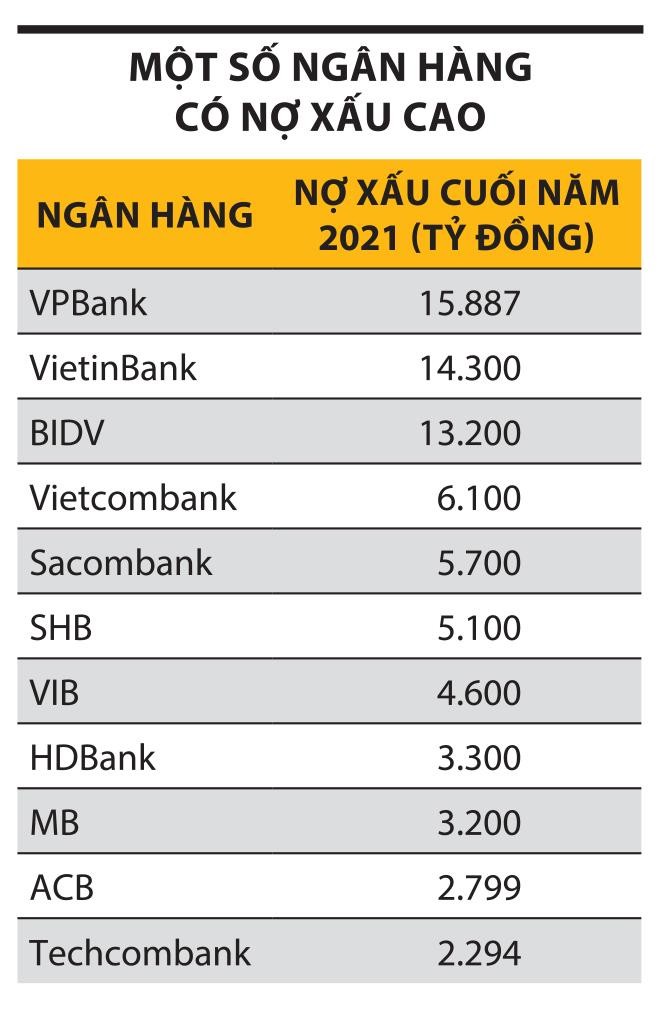 Báo cáo tài chính năm 2021 được các ngân hàng công bố cho thấy, nợ xấu có xu hướng gia tăng rõ rệt. Dẫn đầu là VPBank với con số nợ xấu nội bảng cao nhất ngành là 15.887 tỷ đồng tính đến cuối năm 2021, tăng 60% so với cuối năm 2020, dẫn đến tỷ lệ nợ xấu tăng từ 3,41% lên 4,47%. Số nợ này chủ yếu đến từ các khoản vay tiêu dùng, đặc biệt là từ công ty thành viên FE Credit chiếm khoảng 65%. Nợ nghi ngờ mất vốn (nhóm 4) của Ngân hàng tăng 8 lần so với cùng kỳ năm 2020, lên hơn 8.466 tỷ đồng.