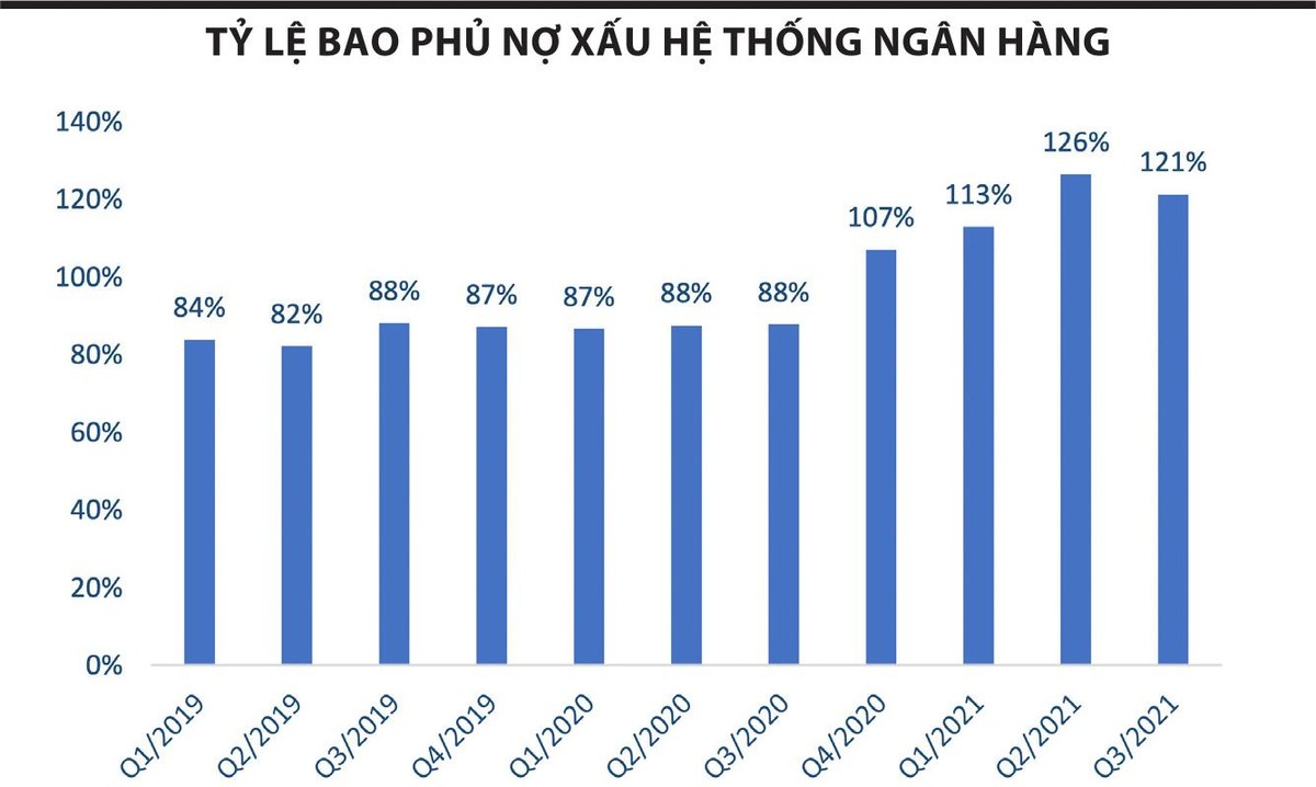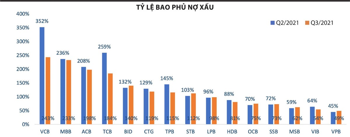 Tương tự, số dư nợ xấu của Vietcombank từ 5.230 tỷ đồng thời điểm đầu năm 2021 tăng lên 10.884 tỷ đồng tính đến cuối quý III/2021, kéo theo tỷ lệ nợ xấu tăng từ 0,62% lên 1,16%, chi phí dự phòng tăng lên 8.012 tỷ đồng, cao hơn 33% so với cùng kỳ năm 2020. Riêng trong quý III/2021, Vietcombank trích lập dự phòng 2.500 tỷ đồng, tăng 25% so với cùng kỳ năm 2020.