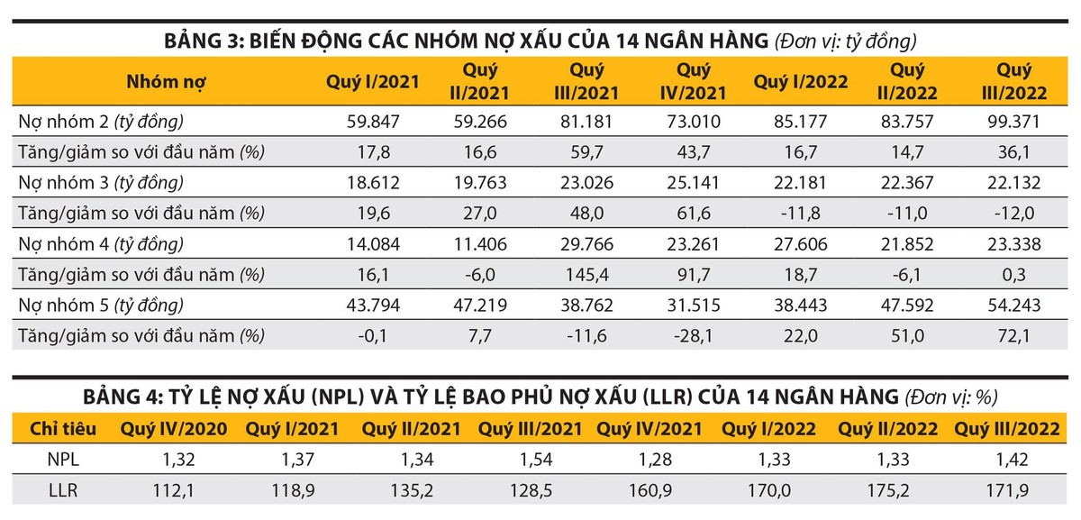 Tổng hợp tỷ lệ nợ xấu (NPL) và tỷ lệ bao phủ nợ xấu của 14 ngân hàng (xem bảng 4) cho thấy, NPL có sự gia tăng trong quý III/2022, nhưng tỷ lệ dự phòng rủi ro tín dụng (LLR) vẫn được đảm bảo tốt - cao hơn so với thời điểm cuối năm 2020 và 2021. Tôi cho rằng, đây là một tín hiệu tích cực khi các ngân hàng đã có sự chuẩn bị trước đối với những rủi ro nợ xấu gia tăng trong tương lai.