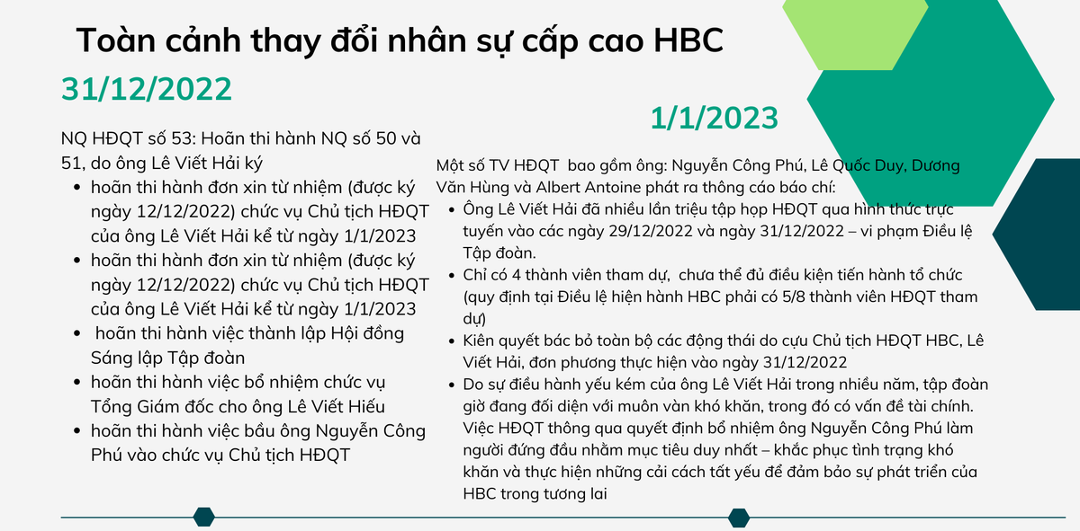 Theo nghị quyết HĐQT số 53, HBC sẽ hoãn thi hành đơn xin từ nhiệm (ký ngày 12/12/2022) chức vụ Chủ tịch HĐQT của ông Lê Viết Hải, có hiệu lực kể từ ngày 1/1/2023; cũng như hoãn thi hành đơn từ nhiệm của ông Lê Viết Hải xin rút khỏi tư cách thành viên HĐQT. Đồng thời, HBC hoãn thi hành việc thành lập Hội đồng Sáng lập Tập đoàn theo Nghị quyết số 50/2022/NQ-HĐQT.HBC ngày 14/12/2022. Nghị quyết cũng thông qua hoãn thi hành việc bổ nhiệm chức vụ Tổng Giám đốc cho ông Lê Viết Hiếu (con trai ông Hải); hoãn thi hành việc bầu ông Nguyễn Công Phú vào chức vụ Chủ tịch HĐQT theo Nghị quyết số 51/2022/NQ-HĐQT.HBC ngày 14/12/2022.