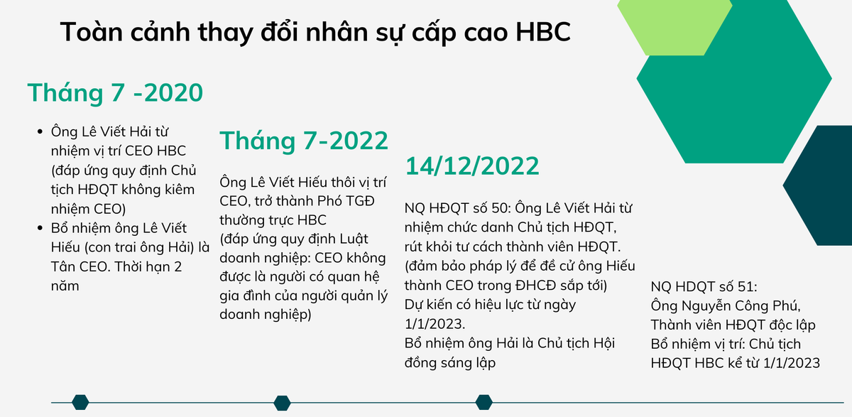 Trước đó, ngày 14/12/2022, HBC đã công bố thông tin Nghị quyết HĐQT (số 50 và 51) về việc chấp thuận đơn xin từ nhiệm vị trí Chủ tịch HĐQT của ông Lê Viết Hải và giữ vai trò Chủ tịch Hội đồng Sáng lập từ ngày 1/1/2023. Đồng thời bổ nhiệm ông Nguyễn Công Phú – Thành viên HĐQT độc lập làm Chủ tịch HĐQT, hiệu lực từ ngày 1/1/2023.
