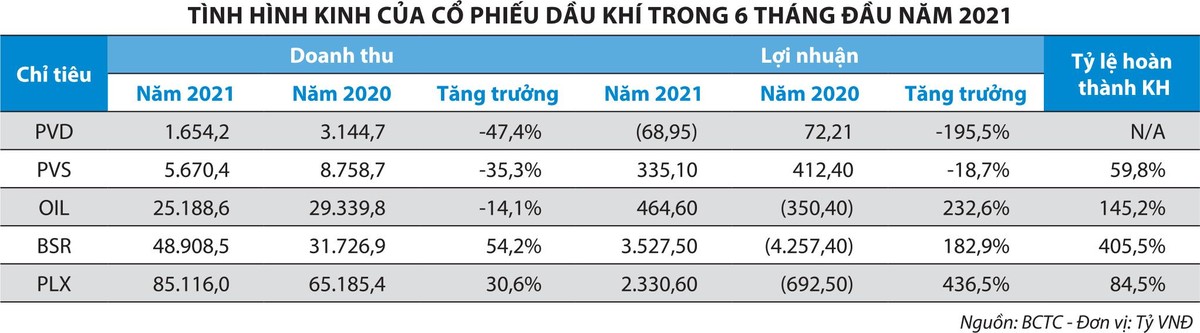 Tập đoàn Xăng dầu Việt Nam (mã PLX) có lãi 2.330,6 tỷ đồng, trong khi cùng kỳ năm trước lỗ 692,5 tỷ đồng; Tổng công ty Dầu Việt Nam - Công ty cổ phần (mã OIL) báo lãi 464,6 tỷ đồng, cùng kỳ lỗ 350,4 tỷ đồng; Công ty cổ phần Lọc hoá dầu Bình Sơn (mã BSR) lãi 3.527,5 tỷ đồng, cùng kỳ lỗ 4.257,4 tỷ đồng.