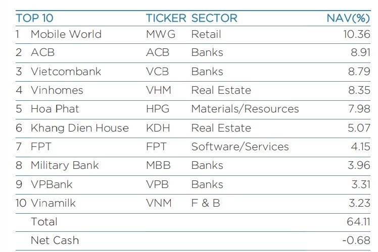 Top 10 cổ phiếu chiếm tỷ trọng lớn nhất danh mục của VOF trong tháng 9 không có nhiều thay đổi so với tháng trước đó. Những vị trí hàng đầu vẫn thuộc về HPG (14,1%), KDH (8,6%), ACV (6,8%), PNJ (5,3%)…