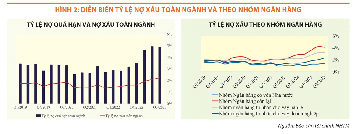 Trong khi nợ xấu ở nhóm các ngân hàng thương mại có vốn nhà nước và các ngân hàng thương mại chuyên cho vay bán lẻ bắt đầu duy trì ổn định, thì nợ xấu tại các ngân hàng thương mại tư nhân cho vay doanh nghiệp tăng mạnh. Nếu như giai đoạn cuối năm 2021, tỷ lệ nợ xấu của các ngân hàng tư nhân chuyên cho vay doanh nghiệp chỉ xấp xỉ các ngân hàng có vốn nhà nước (khoảng 1,4%), thì đến cuối quý III/2023, mức chênh lệch của hai nhóm lớn hơn nhiều (2,3% so với 1,4%).