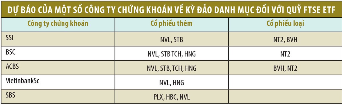 Dự báo của SSI về nhóm cổ phiếu thêm vào đối với FTSE ETF khá tương đồng với nhận định của Công ty Chứng khoán Ngân hàng Đầu tư (BSC) trước đó. BSC còn xem xét khả năng cổ phiếu TCH và HNG có thể được Quỹ thêm vào danh mục, vì ở kỳ đảo danh mục (review) trước đó, 2 cổ phiếu này bị loại do yếu tố vốn hóa.