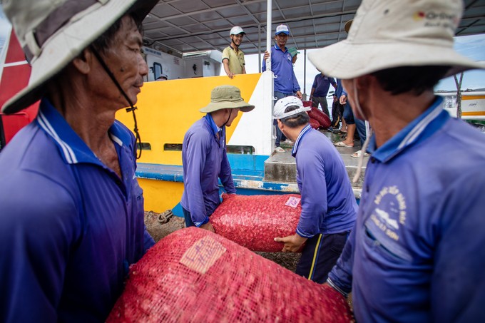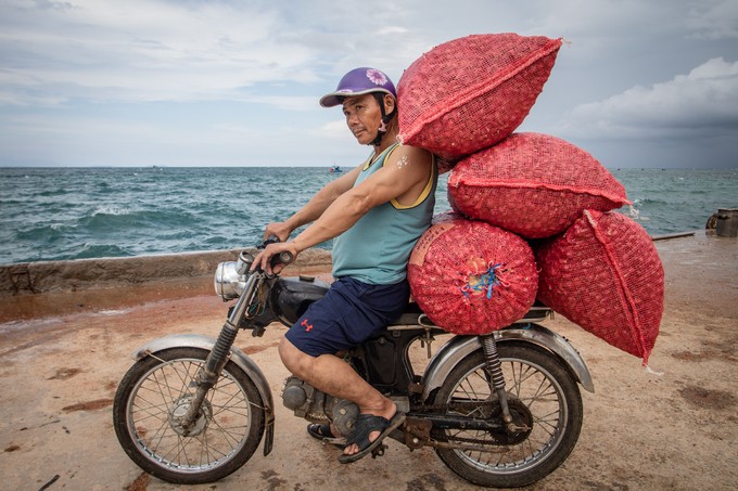 Anh Lê Hoài Ân bên chiếc xe chở bốn bao hành, đứng chờ tàu cao tốc cập cảng. "Mỗi bao hành tím này nặng đến 40 kg. Tất cả sẽ được các tiểu thương phân phối đến TP HCM, Huế và Đà Nẵng", anh Ân nói.