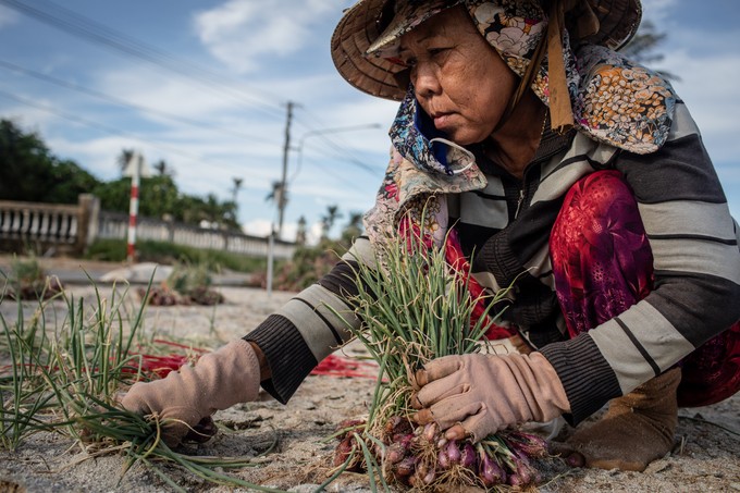 "Mỗi thúng hành (nặng 15 kg), chúng tôi được trả 10.000 đồng. Một ngày, tôi cắt được hơn chục thúng, nên thu nhập cũng đủ ăn", bà Hồng, người cắt hành thuê ở xã An Vĩnh, cho biết.