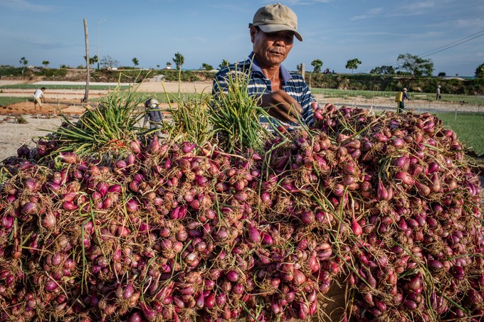 Những củ hành tím được nông dân giũ sạch đất cát và buộc lại thành từng bó, phơi khô trước khi vận chuyển về nhà.