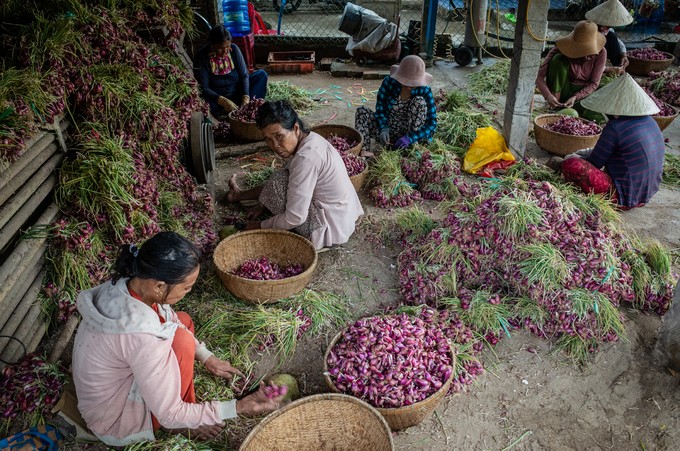 Những phụ nữ cùng cắt tỉa, phân loại hành tím tại một đại lý thu mua ở xã An Vĩnh để kịp vận chuyển vào đất liền tiêu thụ trong ngày.