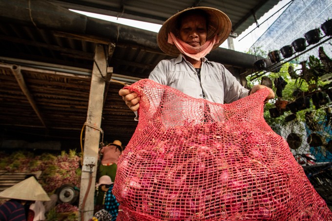 "Lớn tuổi rồi, trời nóng lắm, cộng thêm mùi hành làm cay mắt nên tôi phải đeo khẩu trang, đội nón kín mới làm được", bà Nguyễn Hoa (60 tuổi) nói, khuôn mặt đẫm mồ hôi.