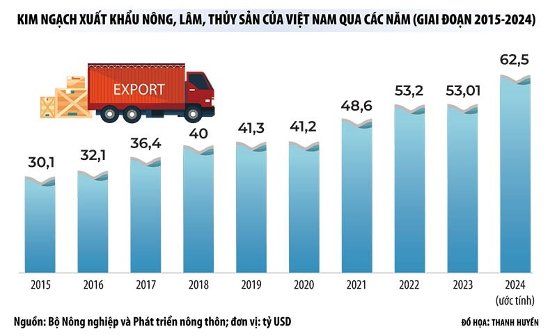 Ngành nông nghiệp Việt Nam đã đi qua năm 2024 bằng nhiều cung bậc cảm xúc, từ nỗi lo vì chuỗi logistics toàn cầu bị ảnh hưởng, cho đến sự đau xót vì những hậu quả nặng nề do cơn bão Yagi để lại, rồi cuối cùng là niềm vui vỡ òa khi toàn ngành đạt kim ngạch xuất khẩu ở mốc 62,5 tỷ USD. Con số này vượt xa mục tiêu xuất khẩu nông - lâm - thủy sản là 55 tỷ USD trong năm 2024. Thậm chí, nếu so với định hướng phát triển chung là tổng giá trị xuất khẩu các sản phẩm nông – lâm - thủy sản của Việt Nam đạt khoảng 60-62 tỷ USD vào năm 2030, thì toàn ngành đã về đích trước 6 năm.
