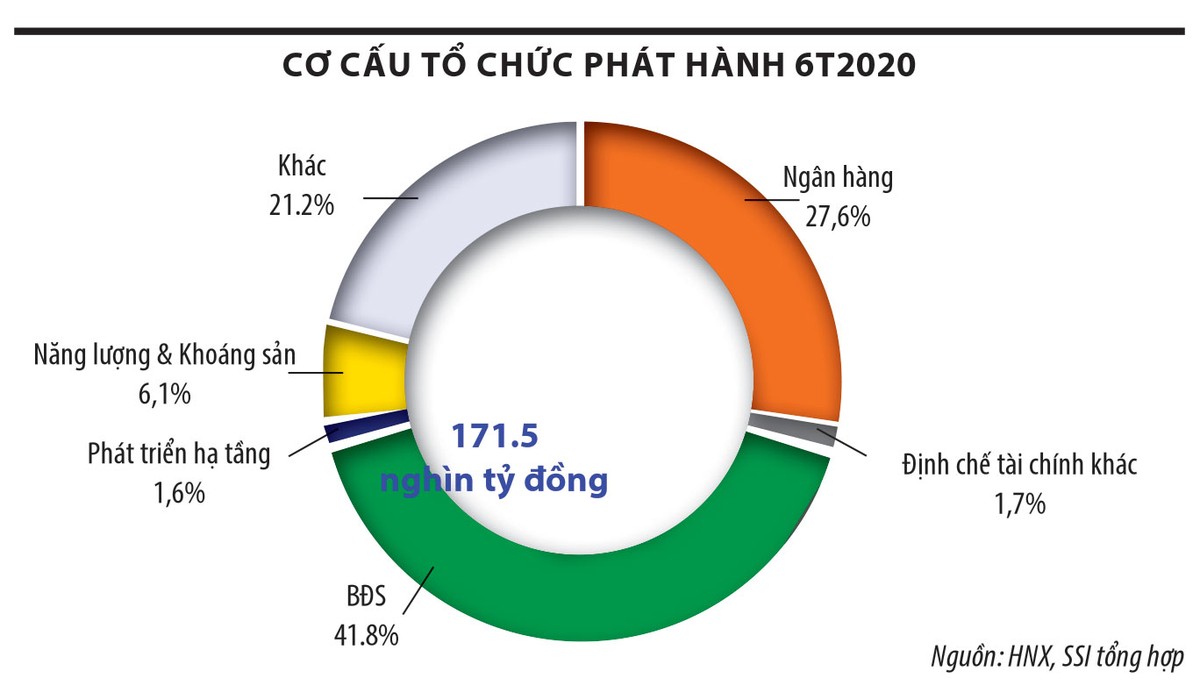 Thống kê của Công ty chứng khoán SSI cho thấy, trong 6 tháng đầu năm, tổng giá trị trái phiếu doanh nghiệp phát hành đạt mức 171.500 tỷ đồng với riêng giá trị trái phiếu phát hành riêng lẻ đạt 161.550 tỷ đồng (chiếm 94,2%). Trong đó, 70% chủ thể phát hành là các ngân hàng và công ty bất động sản và bất động sản trở thành nhóm phát hành trái phiếu lớn nhất thị trường với lượng phát hành lên tới 71.600 tỷ đồng, tăng 57,5% so với cùng kỳ và chiếm xấp xỉ 42% tổng giá trị phát hành.