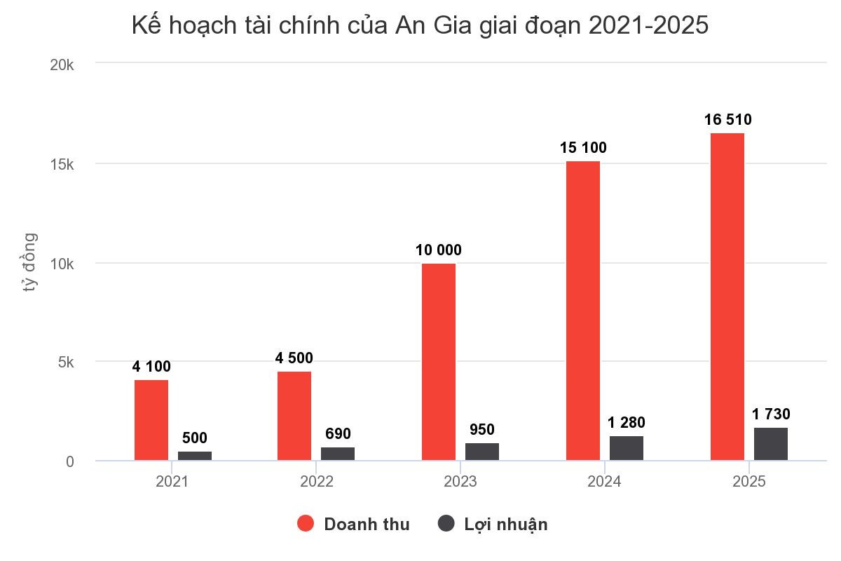 Tính chung giai đoạn 2021 – 2025, An Gia dự kiến tổng doanh thu đạt 50.210 tỷ đồng, lợi nhuận sau thuế dự kiến thu về hơn 6.650 tỷ đồng. Khoảng 27.600 sản phẩm mới có kế hoạch được ra mắt thị trường từ các quỹ đất hiện hữu tại các khu vực như TP.HCM, Bình Dương, Long An và sẽ lần lượt bàn giao từ 2023.