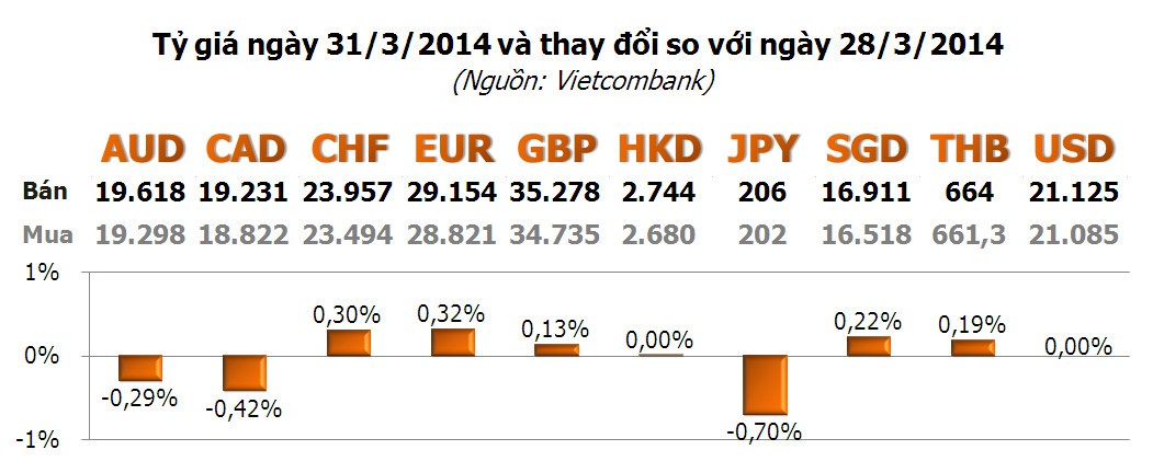 Với các ngoại tệ khác, JPY giảm mạnh nhất với -0,7%; tiếp đến là CAD với -0,42%; AUD với -0,29%. Ở chiều tăng, EUR dẫn đầu với 0,32%; tiếp đến là CHF với 0,30%; SGD với 0,22%...