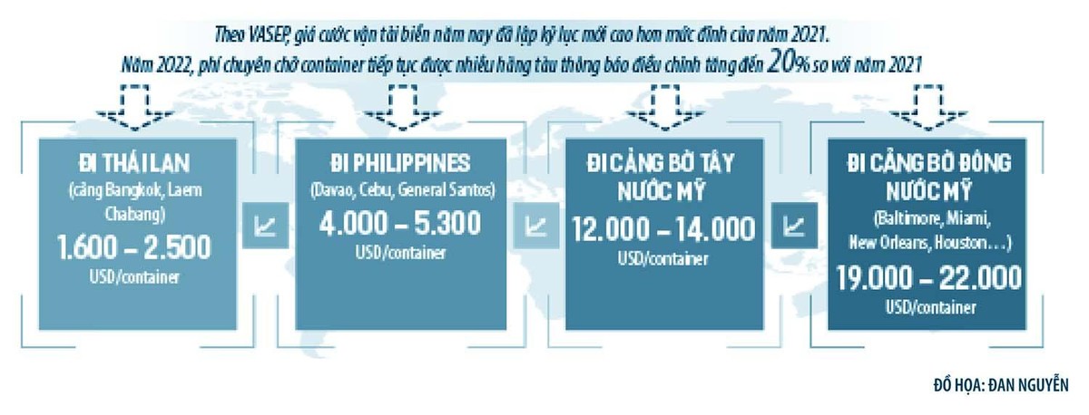 Cụ thể, theo Vasep, giá cước vận chuyển hàng ở hầu hết các chặng tăng 10 - 20% so với trước. Để xuất được một container (cont) 40 feet qua bờ Đông Hoa kỳ (Florida) thì giá cước khoảng 16.400 USD (tương đương 380 triệu đồng).
