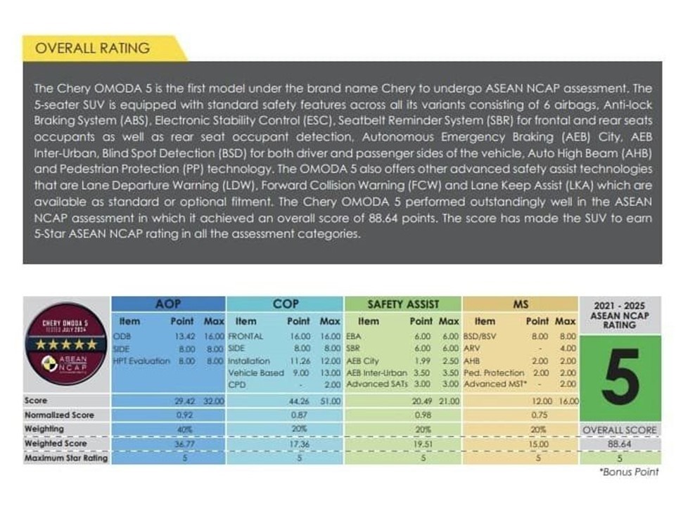 Xếp hạng 5 sao của ASEAN NCAP dựa theo bốn hạng mục đánh giá an toàn chính được xác định theo giao thức mới nhất của ASEAN NCAP 2021–2025. OMODA C5 đã đạt 36,77 điểm trong Bảo vệ người lớn ngồi trên xe (AOP), 17,36 điểm trong Bảo vệ trẻ em ngồi trên xe (COP), 19,51 điểm trong Hỗ trợ an toàn (SA) và 15,00 điểm trong An toàn cho người đi xe máy (MS).