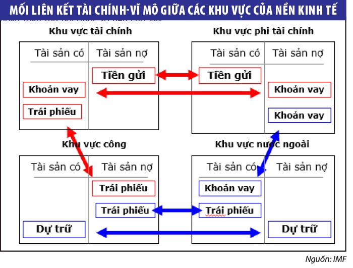 Khu vực tài chính và khu vực kinh tế thực tương tác với nhau thông qua các mối liên kết giữa các nhóm bảng cân đối kế toán của: (i) khu vực phi tài chính (gồm DN và hộ gia đình); (ii) khu vực tài chính (phần lớn là ngân hàng); (iii) khu vực công (ngân sách) và (iv) khu vực kinh tế đối ngoại (đối tác thương mại, đầu tư và viện trợ nước ngoài). (Xem sơ đồ)