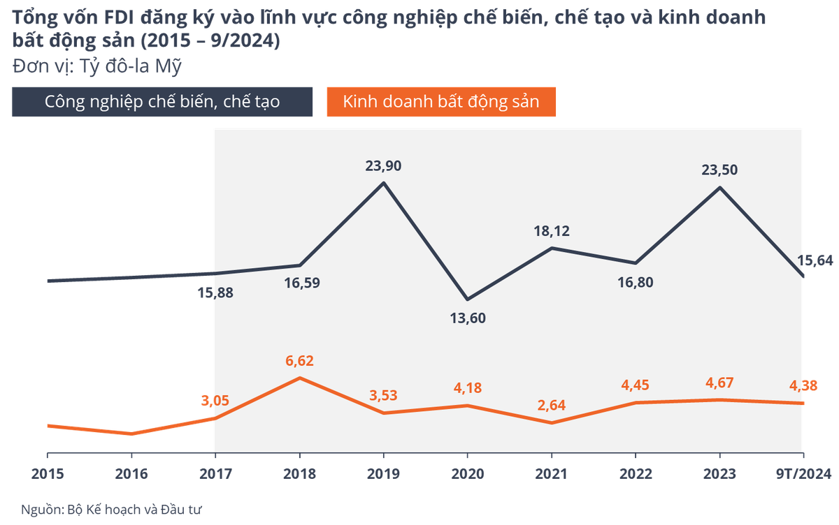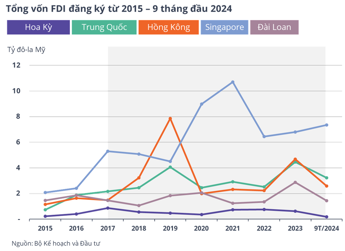 Giai đoạn 2017– tháng 9/2024, tổng vốn FDI đăng ký và thực hiện vào Việt Nam tăng trung bình hàng năm lần lượt là 3,3% và 1,9%. Cùng kỳ, vốn FDI đăng ký từ Trung Quốc, Hồng Kông, Singapore và Đài Loan vào Việt Nam cũng theo xu hướng tăng.