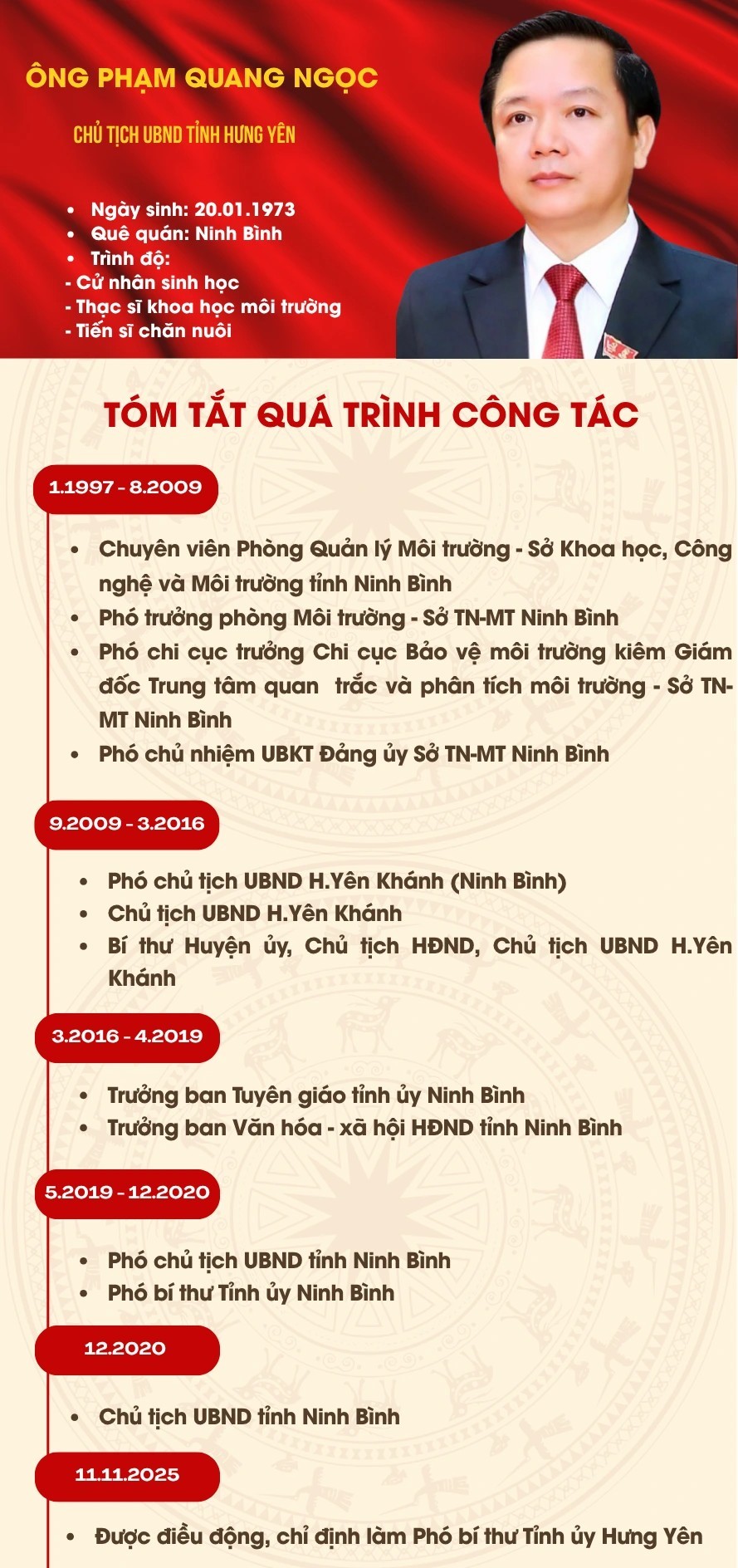 Trước đó, chiều 11/11, Tỉnh ủy Hưng Yên đã tổ chức hội nghị công bố quyết định của Ban Bí thư Trung ương Đảng về việc ông Phạm Quang Ngọc thôi tham gia Ban Chấp hành, Ban Thường vụ và thôi giữ chức Phó Bí thư Tỉnh ủy Ninh Bình nhiệm kỳ 2025 - 2030, để tham gia Ban Chấp hành, Ban Thường vụ và giữ chức Phó Bí thư Tỉnh ủy Hưng Yên nhiệm kỳ 2025 - 2030.