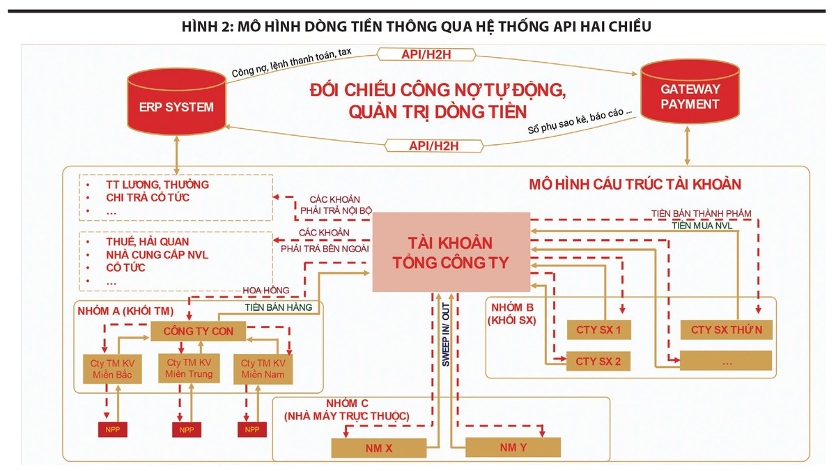 Hình 2 cho thấy, API hai chiều được sử dụng để tích hợp hệ thống Core Banking của ngân hàng với hệ thống ERP của doanh nghiệp. Hệ thống API của ngân hàng có thể kết nối với các sổ phụ ở các ngân hàng khác để có thể tổng hợp thông tin về một mối. Các giao dịch tiền sẽ được dán nhãn dựa trên các mã tài khoản ảo đã được thiết lập, giúp doanh nghiệp quản lý dòng tiền vào từ các nhà phân phối và dòng tiền ra từ các nhà cung cấp theo thời gian thực một cách đơn giản, từ đó thực hiện việc tối ưu dòng tiền.