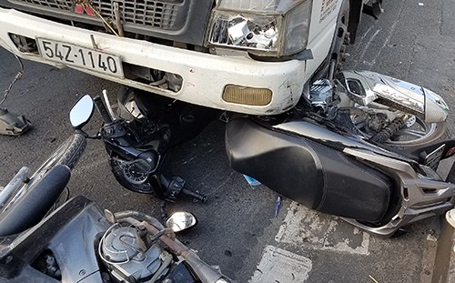 Tại hiện trường 5 xe máy nằm ngổn ngang trên đường; một xe SH bị cuốn vào gầm, phía trước đầu xe tải. Giao thông qua khu vực bị ùn ứ kéo dài.