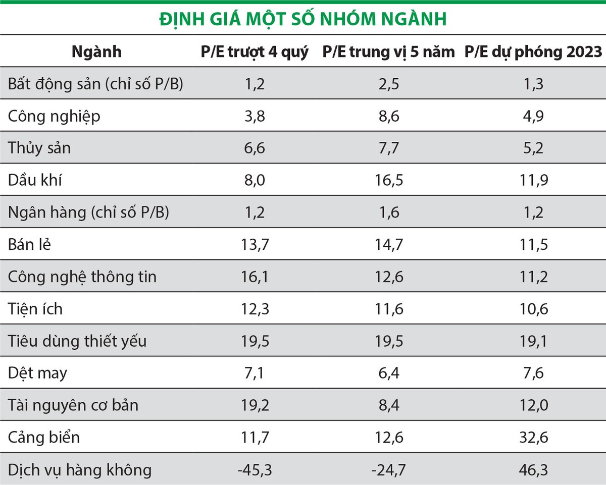 Một số nhóm ngành có định giá cao hơn quá khứ chủ yếu là nhóm cổ phiếu bị ảnh hưởng mạnh về triển vọng lợi nhuận năm 2023 như dệt may, tài nguyên cơ bản, cảng biển, dịch vụ hàng không. Triển vọng của các nhóm trên có được cải thiện hay không sẽ phụ thuộc nhiều vào tốc độ phục hồi kinh tế.